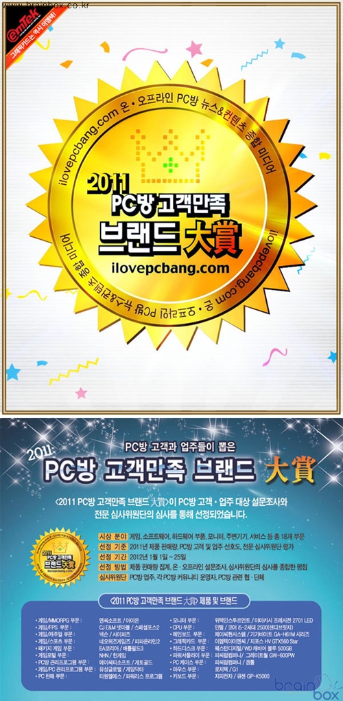 국내 컴퓨터 그래픽카드 시장을 선도하고 있는 (주)이엠텍아이엔씨(대표:이덕수, www.emtekinc.com)가 PC방 저널 "아이러브PC방"에서 주관하는 <2011년 PC방 고객만족 브랜드 대상> 그래픽카드 부문에 선정되는 영예를 차지했다. <2011년 PC방 고객만족 브랜드 대상>은 한 해 동안의 제품 판매량과 PC방 고객 및 업주의 선호도를 집계해 전문 심사위원단의 철저한 검증과 평가를 거쳐 가장 우수한 점수를 받은 브랜드를 선정 발표한다. (주)이엠텍아이엔씨는 가격비교 사이트 <다나와>에서 NVIDIA 그래픽카드 부문, AMD 그래픽카드 부문, AMD 메인보드 부문의 3개 부문에서 히트브랜드 수상과 국내 유일의 PC 전문 매거진 <PC사랑>에서도 베스트 프로덕트 수상에 이어 <PC방 고객만족 브랜드 대상>까지 석권하며 명실상부한 국내를 대표하는 PC 그래픽카드 브랜드의 위상을 다시 한번 확인 하였다.