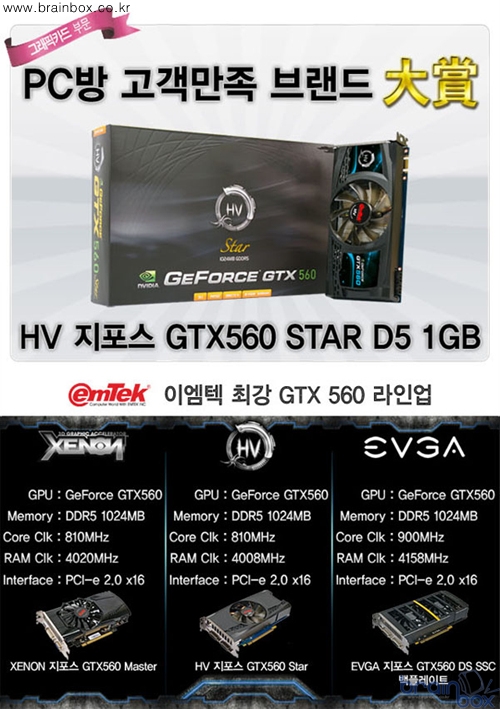 이번에 <2011년 PC방 고객만족 브랜드 대상>을 수상한 <HV 지포스 GTX 560 STAR D5 1GB>는 엔비디아의 퍼포먼스급 그래픽카드로 지난 해 5월 첫 선을 보인 이래 20만원 초반대의 합리적인 가격과 동급 경쟁 제품 대비 높은 성능을 가지고 있는 이른바 가성비가 뛰어난 제품으로 출시 초기부터 큰 인기를 얻으며 PC방 업주들이 가장 선호하는 제품으로 등극하였다. 특히 <HV 지포스 GTX 560 STAR D5 1GB>는 PC방의 사용 환경을 고려하여 방열 성능에 각별한 신경을 기울인 제품으로 GPU와 직접 맞닿는 DTH 기술의 히트파이프와 대형 냉각팬, 발열이 높은 전원 회로를 위한 전용 히트싱크, 외부로 더운 공기를 밀어내는 에어 덕트 커버와 대형 통풍구 등을 구비해 장시간 사용에도 높은 안정성을 유지해 주는 장점이 있다. <2011년 PC방 고객만족 브랜드 대상> 수상과 관련하여 (주)이엠텍아이엔씨 오병찬 홍보팀장은 "지난 한 해동안 PC방 고객들과 사업주 여러분들이 보내주신 성원에 힘입어 고객 만족 브랜드 대상의 영예를 안을 수 있게 되었다. 이에 만족하지 않고 앞으로도 양질의 제품을 합리적인 가격에 공급하고 철저한 사후지원으로 더 많은 사랑을 받을 수 있도록 노력하겠다."라고 전했다.