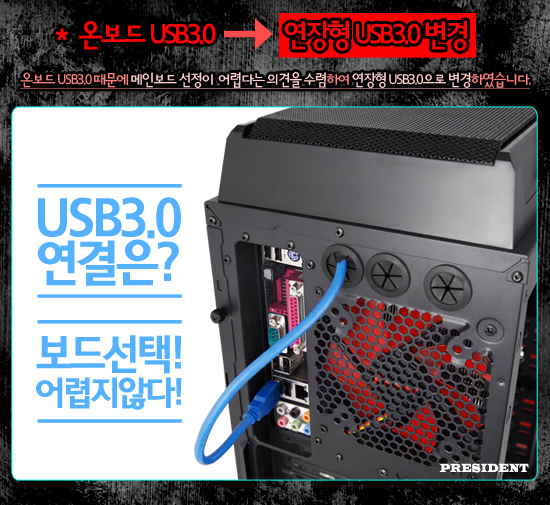'프레지던트' 케이스는 하이그로시가 접목된 풀매쉬 스타일의 앞면 베젤 구조와 하단 파워 설치 및 상단 배기 시스템을 채택한 제품이다. 넉넉한 사이즈와 함께 여러 편의사양과 쿨링 시스템을 구비하고 있고, 하드도킹시스템, 팬컨트롤, USB3.0, 케이지식 하드베이, 튼튼한 섀시 등 다양한 특징을 갖췄다.