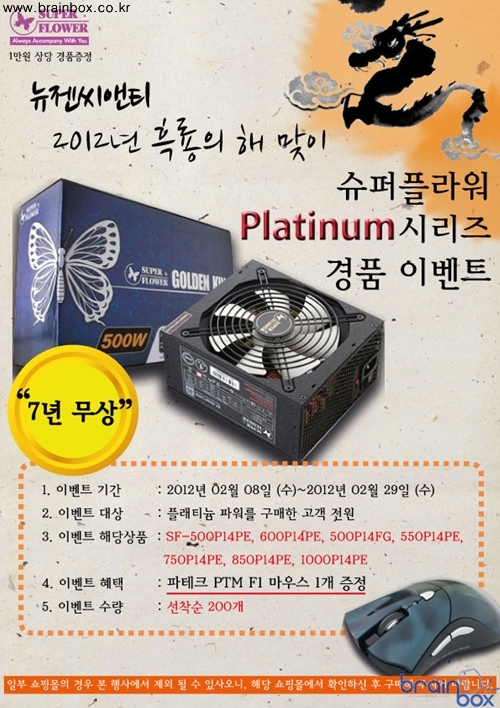 파워서플라이 전문업체인 ㈜뉴젠씨앤티(대표 왕규희 http://www.newzencnt.com )는 흑룡의 해 맞이를 기념해 Super-Flower Platinum 시리즈 구매 고객 대상으로 10,000원 상당의 파테크 PTM-F1 마우스 경품 제공 행사를 진행한다. 뉴젠씨앤티 관계자는 “슈퍼플라워 플래티늄이 시장에서 선풍적인 인기를 끌고 있으며, 제품을 사랑해주시는 소비자들에게 감사의 뜻을 전하기 위해 준비한 이벤트” 라고 말했다. 이번 이벤트는 지정된 쇼핑몰에서 200개 한정으로 플태티늄 제품을 구매하는 고객 전원에게 제공한다. ▶ 이벤트 안내