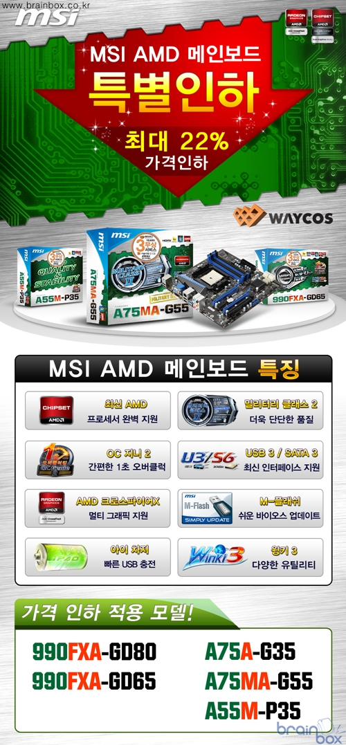 세계 정상급 토탈 IT 솔루션 제조사, MSI의 한국 공식 디스트리뷰터인 ㈜웨이코스(대표:고민종)가 소비자에게 꾸준한 사랑을 받아온 MSI AMD 메인보드 5종의 가격을 특별 인하한다.