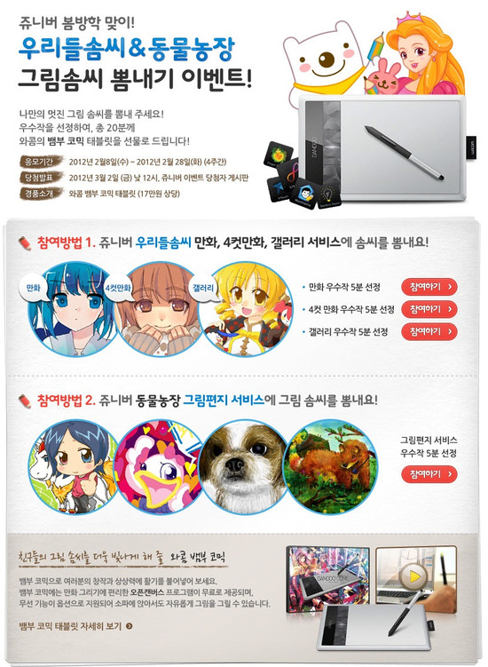 만화 콘테스트 형식의 이번 이벤트는 쥬니버 '우리들솜씨’ 서비스의 갤러리, 4컷 만화, 만화 코너와 ‘동물농장' 서비스의 그림편지 코너의 게시판을 통해 자신이 그린 만화 혹은 웹툰 등의 창작물을 게재해 응모할 수 있다. 각 코너의 우수작 선정자(각 5명) 총 20명에게는 와콤의 뱀부 코믹 태블릿이 증정되며, 최종 당첨자는 오는 29일 쥬니버 이벤트 당첨자 게시판을 통해 발표된다.
