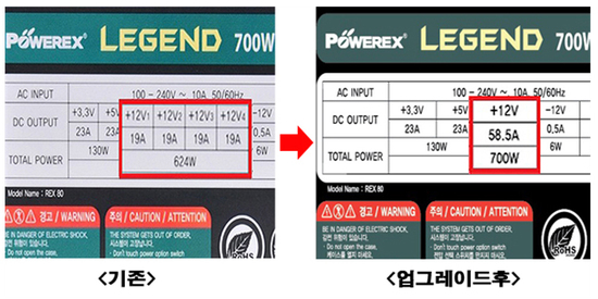 먼저 'POWEREX LEGEND 700W 80PLUS 브론즈'는 기존 멀티 12V 환경에서 싱글 12V 단독 레일 환경으로 업그레이드해 오버클럭 환경에서 전압변동폭을 줄였다. 또한 12V 가용량을 624W에서 700W로 끌어올려 전체 파워 용량인 700W 모두를 12V로 사용 가능케 했다.