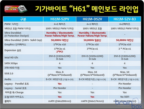 마지막으로, GA-H61MA-D3V 메인보드는 100% VRD12 호환 PWM, 뛰어난 확장성의 Rear IO 디자인, 아이폰 퀵-차지등 기가바이트만의 Unique Features들도 기존 제품과 같이 지원하며 출시 가격은 5만원 후반대(Open Price)에 출시 되었다.