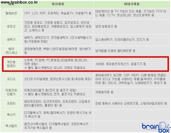 얼마 전에 벌어졌던 컴퓨존 아이윅스 PC 등의 조립 PC의 전자파인증 문제와 더불어 용산 전자 상가에 큰 악재가 겹쳤다. 즉 환경성보장제는 컴퓨터 판매자가 신 제품을 판매하게 되면 사용자들이 사용하고 있던 기존의 컴퓨터 시스템을 회수 해야 하는 법이다. 대상품목으로 지목된 것은 "노트북, PC 본체, PC 본체 모니터 일체형 등과 모니터 그리고 자판이 포함이 되는데 이 중에 별도로 출시 판매되는 모니터와 자판도 적용대상이다. 모니터외 자판이 포함된 것은 무선 키보드 마우스 등의 자판이 별도의 전원을 넣어야 하는 것으로 인한 것으로 보인다. 이처럼 용산 업체은 모니터와 자판을 비롯 조립 PC를 판매하고 있는 이상, 직 간접적으로 매출에 영향을 받을 것으로 예상된다. 환경성보장제의 자세한 설명은 www.ecoas.or.kr 를 통해 볼 수 있다. |