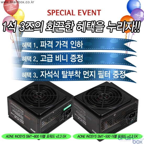1+1 행사에 추가 보너스로 INOSYS SMT 600 더블포워드 제품과 SMT 500 더블 포워드 제품은 120mm 자석식 탈부착 먼지 필터를 기본으로 무상 제공 하고 있는 제품으로써 (싯가 3,000원) 파워내 먼지 유입을 차단 함으로써 먼지로 인한 쇼트의 발생 확률을 줄여 주고 쿨링팬의 수명을 연장 시켜 주어 그로 인한 파워 서플라이의 수명을 연장 시킬수 있다고 한다. 초정밀 SMT제조 공정 생산으로 불량율을 최소화 하였으며 기존의 파워 서플라이들이 주로 사용하던 하프브릿지, 포워드 컨버터 방식에서 획기적으로 성능이 향상된 더블 포워드 컨버터 방식 회로 설계로 고효율과 안정성을 강화한 제품이라고 한다. 또한 기본 적으로 제공하는 먼지필터는 파워 뿐만아니라 케이스에도 장착이 가능하여, 여러가지 용도로 사용 가능한 장점이 있다.