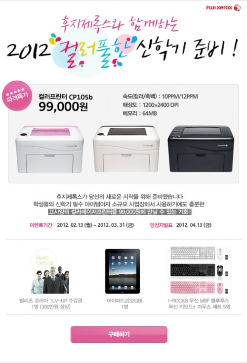 후지제록스 프린터스(www.xeroxprinters.co.kr)가 신학기를 맞아 고사양 컬러 레이저 프린터를 9만9000원 할인가에 판매하는 ‘2012 컬러풀한 신학기 준비 이벤트’를 2월 13일부터 3월 31일까지 실시한다고 금일 밝혔다.