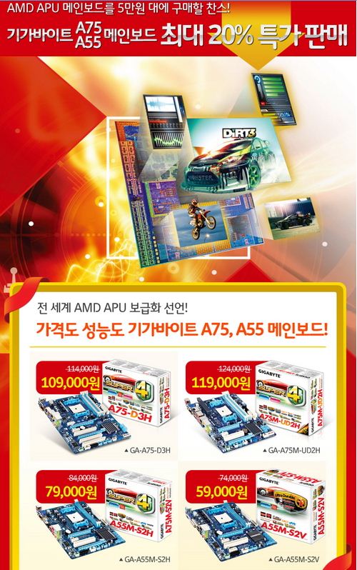 이번 특가 판매로 기가바이트 GA-A75M-UD2H 메인보드는 12만4000원에서 11만9000원, GA-A75-D3H는 11만4000원에서 10만9000원, GA-A55M-S2H는 8만4000에서 7만9000원, 마지막으로, GA-A55M-S2V는 7만4000원에서 1만5000원 내린 5만9000원으로 최대 20% 할인이 적용되며, 2월 한 달간 출고분에 대해 적용된다.