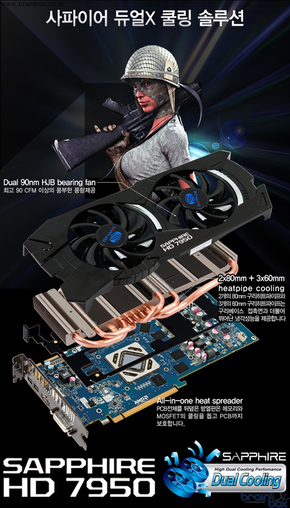 온도와 소음을 모두 만족 시켜주는 Dual Extractor 기술의 Dual-X 쿨러 탑재 <SAPPHIRE Radeon HD 7950 OC>는 Dual Extractor 기술을 적용한 신형 Dual-X 쿨러로 오버클럭된 GPU의 발열을 효과적으로 제거하고 있다. Dual-X 쿨러는 한층 세련된 외형과 함께 특수 캡으로 먼지 유입을 방지해 수명을 증대시킨 HJB 베어링을 사용한 2개의 90mm 대구경 팬으로 낮은 회전속도에서도 90 CFM 이상의 큰 풍량을 얻을 수 있게 설계되었으며, 애프터 마켓의 고급형 쿨러에서나 볼 수 있는 핀 블레이드 적층 공법을 사용하고 방열핀에 사용된 5개의 히트파이프 중 2개의 히트파이프는 직경 8mm의 수퍼파이프를 적용하여 냉각 성능을 극대화하고 있다. 또한 PCB 휨 방지 기능을 겸비한 전원회로 MOSFET과 메모리를 빠르게 냉각시켜주는 일체형 히트 스프레더 플레이트를 더해 그래픽카드의 전체적인 냉각 성능을 배가하고 PCB를 보호해 주는 기능까지 함께 하고 있다. 이러한 강력한 냉각 성능을 바탕으로 <SAPPHIRE Radeon HD 7950 OC>는 그래픽카드 부하 테스트 유틸리티인 FurMark의 20분 Burn-in 테스트에서 불과 61℃ 의 낮은 온도를 보여주고 있으며 이 때 팬속도 41%(1615rpm)에 22dB/A라는 놀라운 소음 수치를 나타냈다.