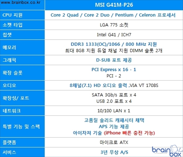 MSI G41M-P26 메인보드는 인텔 G41 칩셋을 장착하여 인텔 45nm 공정을 적용한 요크필드와 울프데일 프로세서를 지원하며, 강력한 성능을 제공할 수 있도록 코어2 쿼드 프로세서까지 지원하여 폭넓은 CPU 확장성을 제공한다. 자체적으로 DirectX 10 및 OpenGL 2.0 을 지원하는 인텔 GMA X4500 그래픽 코어를 내장하고 있으며, 이를 활용하기 위한 D-SUB 포트를 기본 제공하여 별도의 그래픽 카드 없이도 모니터를 연결할 수 있는 기능성을 제공한다. MSI G41M-P26 메인보드는 다양한 시스템 로딩 상황에서 맞추어 매우 빠르고 신속하게 전력 소비량을 최소화 할 수 있는 APS 기술을 탑재하고 있다. 고품질 솔리드 캐패시터 MSI G41M-P26 메인보드는 CPU 및 메인보드에 안정적인 전력을 공급하기 위하여 전원부에 솔리드 캐패시터를 사용하였다. 더욱 강력한 그래픽 성능을 원하는 소비자 계층을 고려하여 외부 그래픽 카드를 장착할 수 있는 PCI Express x16 슬롯을 제공하고 있으며, 추가로 PCI Express x1 및 PCI 슬롯을 제공하여 다양한 부가기능을 제공하는 확장 카드들을 장착할 수 있다. 다양한 입출력 포트 메인보드 핵심 콘트롤러 칩셋인 G41 + ICH7 칩셋의 발열량을 효과적으로 제거하기 위해 대형 히트싱크를 기본적으로 장착하고 있으며, 팬이 없는 디자인으로 무소음 환경을 지향하고 있다. 다양한 부가기기와의 연결을 위해 최대 3.0Gb/s의 데이터 전송속도를 내는 4개의 SATA II 포트와 4개의 USB 2.0 포트 그리고 10/100 LAN / 7.1채널 HD 오디오 포트 등을 기본 제공한다. MSI G41M-P26? 공식 스펙 ※ MSI G41M-P26 제품 정보 : http://blog.danawa.com/prod/1599319 MSI 공식 한국 디스트리뷰터인 ㈜웨이코스가 국내에 유통하는 MSI 메인보드는 타사 저가형 메인보드와 차별화된 3년 무상 A/S 를 제공하며, 제품에 대한 더욱 자세한 내용은 웨이코스 홈페이지 (http://www.waycos.co.kr / 02-712-8999)을 참조하면 된다. |