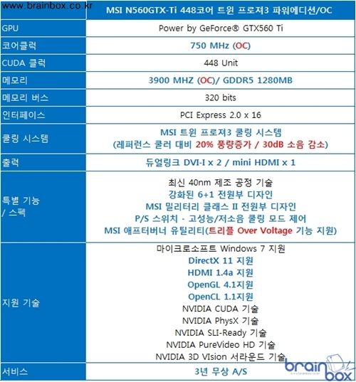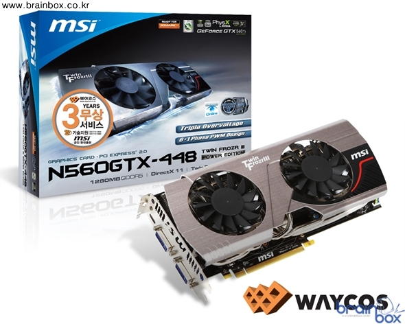 세계 최고의 VGA 제조 기술력을 갖춘, MSI의 한국 공식 디스트리뷰터인 ㈜웨이코스(대표:고민종)가 NVIDIA 고성능 그래픽 코어인 지포스 GTX 560-Ti 448 쿠다코어 GPU를 장착하고 더욱 강화된 6+1 전원부 / 고해상도 게이밍을 위한 1.2GB 메모리 / 최신 트윈 프로져 3 쿨링 시스템 / PS 스위치 / 트리플 팩토리 OC / 트리플 전압 오버 기능을 제공하는 “MSI N560GTX-Ti 448 트윈 프로져 3 파워 에디션/OC” 제품을 출시하였다.