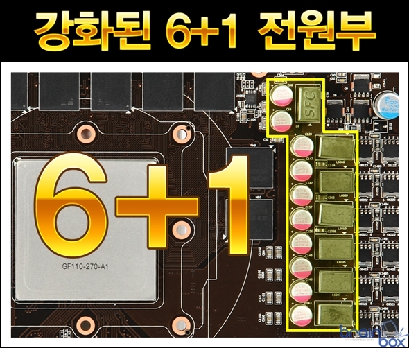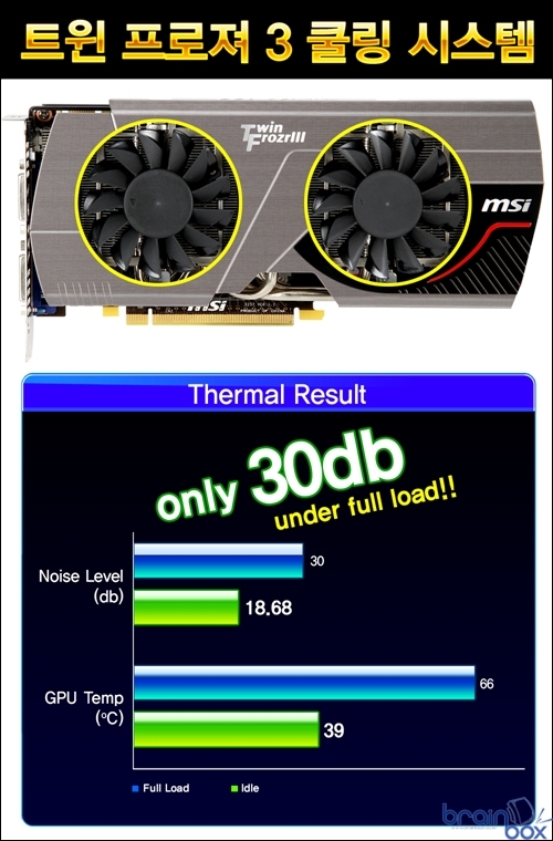 강화된 6+1 전원부 디자인 ? OC에 더욱 강하다. MSI N560GTX-Ti 448 트윈 프로져 3 파워 에디션/OC 제품은 레퍼런스 제품보다 향상된 6+1 전원부 디자인을 제공하는 제품이다. 더욱 강화된 6+1 전원부 디자인으로 인해, 사용자가 오버클럭에 도전할 때 그래픽카드에 충분히 많은 전력을 공급해 줄 수 있어 더욱 높은 클럭에 도전할 수 있도록 하드웨어 차원에서 든든하게 지원해 준다. 고해상도 3D 게이밍을 위한 1.2GB 메모리 장착 MSI N560GTX-Ti 448 트윈 프로져 3 파워 에디션/OC 제품은 고해상도에서 더욱 빠른 3D 성능을 제공하기 위해, 기존 지포스 560-Ti 제품보다 메모리 용량이 증가된 1.2GB (1280MB) 메모리를 장착하고 있다. 이로서 고해상도 3D 게이밍 및 다양한 이펙트가 적용된 하이퀄리티 그래픽 환경에서 더욱 부드럽고 빠른 성능을 보장해준다. 최신 트윈 프로져 3 쿨링 시스템 ? 30dB 저소음 제공 MSI N560GTX-Ti 448 트윈 프로져 3 파워 에디션/OC 제품은 레퍼런스 제품보다 더욱 강화된 성능을 제공하는 “트윈 프로져 3” 쿨링 시스템을 장착한 제품이다. 트윈 프로져 3 쿨링 시스템은 MSI가 자체 개발한 고유의 쿨링 솔루션으로서, NVIDIA 레퍼런스 쿨러보다 우수한 쿨링 성능을 제공하여 풀로딩 환경에서도 30dB 저소음을 제공하는 탁월한 쿨링 성능을 제공한다.
