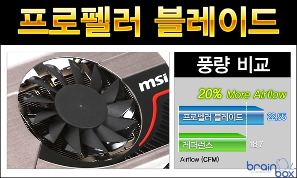 MSI 트윈 프로져 3 쿨링 시스템에는 VGA에 더 많은 풍량을 제공하기 위하여 MSI VGA 엔지니어링 팀이 연구 개발한 독창적인 디자인의 “프로펠러 블레이드” 타입의 팬이 장착된다. MSI 프로펠러 블레이드는 팬 날개 디자인 변경을 통해 기존 팬 보다 20% 더 많은 풍량을 히트싱크 및 VGA 기판에 공급할 수 있다.