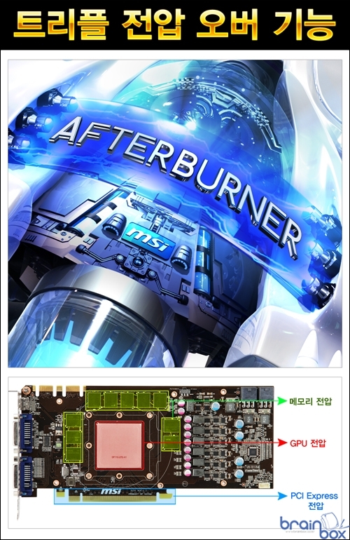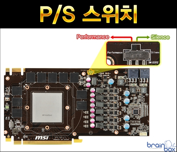 MSI 트윈 프로져 3 쿨링 시스템은 메모리 / 전원부 및 기판 전체의 발열량을 흡수하여 제거하는 “일체형 히트싱크” 를 장착하여, 오버클러킹 환경에서도 낮은 기판 온도를 유지시켜 준다. 아울러 일체형 히트싱크는 전체적으로 기판에 넓게 퍼져있기 때문에, 쿨러의 장력으로 인한 기판의 휨 현상을 방지 해주는 “휨 방지 역활” 도 제공할 수 있다. P/S 스위치 ? 고성능 / 저소음 쿨링 모드 제어 MSI N560GTX-Ti 448 트윈 프로져 3 파워 에디션/OC 제품은 P/S 스위치를 제공하여 쿨러의 동작모드를 사용자가 직접 설정할 수 있다. 기판 우측 상단에 위치한 P/S 스위치는 사용자가 직접 조작할 수 있으며, Performance (고성능) 모드는 보다 높은 쿨링 성능을 제공하며, Silence (저소음) 모드는 보다 조용한 쿨링 소음을 제공하는 특성을 제공한다. 사용자의 취향에 따라 P/S 스위치를 통해 쿨러의 동작 환경을 제어할 수 있기 때문에, 오버클럭에 관심이 높은 사용자는 Performance 모드를 통해 강력한 쿨링 성능을 제공받을 수 있으며, 저소음 PC 구현에 관심이 높은 사용자는 Silent 모드를 통해 그래픽 카드에서 발생하는 소음을 최소화 할 수 있다. 트리플 팩토리 클럭 - 더욱 빠른 3D 성능 MSI N560GTX-Ti 448 트윈 프로져 3 파워 에디션/OC 제품은 팩토리 오버로 코어 / 프로세서 / 메모리 클럭이 레퍼런스 제품보다 향상되어 더욱 빠른 3D 가속 성능을 체감할 수 있다. 본 제품의 코어 클럭은 레퍼런스 클럭보다 향상된 750MHz 클럭으로 설정되어 있으며, 프로세서 클럭은 1500MHz, 메모리 클럭은 3900MHz 클럭을 제공한다. 클럭이 향상된 만큼 발열량이 높아지기 때문에 이를 해소하기 위하여 고성능 트윈 프로져 3 쿨링 시스템을 장착하였으며, 추가적인 오버클럭에 도전하기를 원하는 소비자 계층을 위하여 레퍼런스 디자인보다 더욱 강화된 6+1 전원부 디자인을 제공한다. MSI 애프터버너 ? 트리플 전압 오버 기능 MSI N560GTX-Ti 448 트윈 프로져 3 파워 에디션/OC 제품은 MSI 애프터버너 유틸리티를 기본 제공하여, 그래픽 카드로 더욱 높은 성능향상을 꿈꾸는 사용자 계층에게 편리한 기능성을 제공한다. MSI 애프터버너는 세계적으로 유명한 VGA 오버클럭 & 튜닝 유틸리티인 “Riva Turner” 와 공식 라이센스 계약을 체결하고 함께 개발한 VGA 튜닝 유틸리티로서, 최신 MSI 그래픽 카드 패키지에 포함되어 있는 VGA 튜닝 유틸리티다. MSI 애프터버너 유틸리티를 통해 사용자는 GPU 클럭 / 쉐이더 클럭 / 메모리 클럭 / 팬 스피드 등을 자유롭게 조절할 수 있으며, MSI VGA 의 현재 동작 환경에 대한 자세한 정보 (모니터링 기능)도 얻을 수 있다. 특히 MSI N560GTX-Ti 448 트윈 프로져 3 파워 에디션/OC 제품은 MSI 애프터버너 유틸리티를 통하여 GPU-메모리-PCI Express 슬롯에 공급되는 전압을 조절할 수 있는 특별 기능(트리플 전압 OC)을 제공하여, 오버클럭 매니아 계층에게도 어필할 수 있는 강력한 OC 기능을 제공한다. ※ MSI N560GTX-Ti 448 트윈 프로져 3 파워 에디션/OC 공식 스펙 ※ 제품 정보 : http://blog.danawa.com/prod/1608114 MSI 공식 한국 디스트리뷰터인 ㈜웨이코스가 국내에 유통하는 MSI 그래픽카드는 타사 저가형 VGA 와 차별화된 3년 무상 A/S 를 제공하며, 더욱 자세한 내용은 웨이코스 홈페이지 (http://www.waycos.co.kr / 02-712-8999)을 참조하면 된다. |