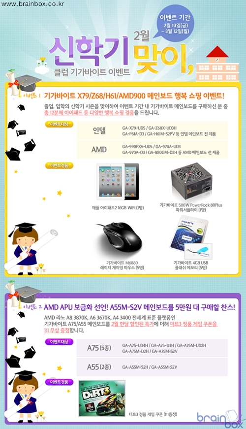 기가바이트 2월 신학기 맞이 행복 쇼핑 이벤트는 용산 Top7 쇼핑몰 (컴퓨존, 아이코다, 조이젠, 이지가이드, 피씨포올, 아이클럽, 아이티앤조이)을 통해 2월 10일(금)부터 3월 11일(일)까지 진행되는 이벤트로써, 기가바이트 X79/Z68/H61/AMD900 시리즈 메인보드를 구매하신 분 중 총 12분께 아이패드2, 기가바이트 PoweRock 80Plus 500W, 게이밍 레이저 마우스, 4GB 플래쉬 메모리 등 다양한 행복 쇼핑 경품을 지급한다.
