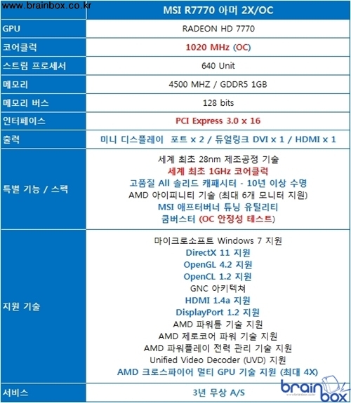 ※ 제품정보 : http://blog.danawa.com/prod/1608639 MSI 공식 한국 디스트리뷰터인 ㈜웨이코스가 국내에 유통하는 MSI 그래픽카드는 타사 저가형 VGA 와 차별화된 3년 무상 A/S 를 제공하며, 더욱 자세한 내용은 웨이코스 홈페이지 (http://www.waycos.co.kr / 02-712-8999)을 참조하면 된다. |