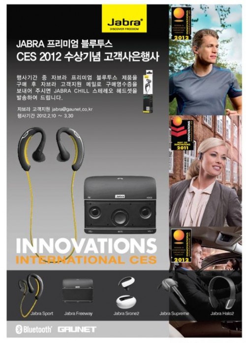 최근 미국 라스베가스에서 개최된 세계 최대 규모의 국제 가전 전시회 (CES) 2012에서 2012년 이노베이션 제품상의 수상한 것을 기념해 진행되는 이번 고객 행사는 CES 수상 제품인 Jabra SPORT(스포츠)와 FREEWAY을 비롯해 최근 출시된 Jabra STONE(스톤)2 및 Jabra Supreme(슈프림)과 HALO(할로)2 등의 프리미엄 제품을 구입하는 모든 고객들을 대상으로 자브라의 스마트폰 전용 스테레오 헤드셋인 ‘CHILL’이 증정된다.