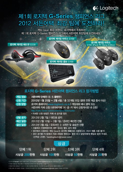 첫 번째 ‘G-시리즈 서든 어택 챔피언스 리그’는 로지텍이 주최하는 로지택배 서든어택 단체전(5:5 클랜 전)참가 이벤트로 행사기간 내 예선 및 결선을 통한 우승자에게는 단체 1위(상금 200만원), 2위(상금 100만원), 3위(상금 50만원), 4위(20만원)이 상금으로 증정된다.