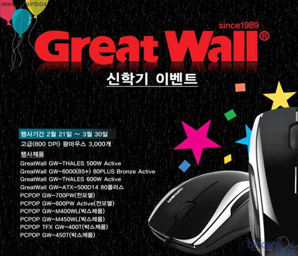 믿을 수 있는 파워, 그레이트 월의 파워 서플라이를 구입하면 게임용 광 마우스가 공짜로 따라온다. 피씨팝컴퍼니 주식회사에서 실시하는 신학기 이벤트로 2월 21일부터 3월 30일까지 약 한달간 진행된다. 행사 제품은 그레이트월 파워와 PCPOP 시리즈에 한하여 진행되며, 해당 제품은 자료사진과 같이 적용된다. 행사 기간동안 아래 목록에 적힌 파워서플라이를 구매할 경우 구매처에 연락해 요구하면 게이밍 마우스를 같이 받을 수 있다. 해당 이벤트 관련 문의전화는 02-718-8112로 하면 된다.