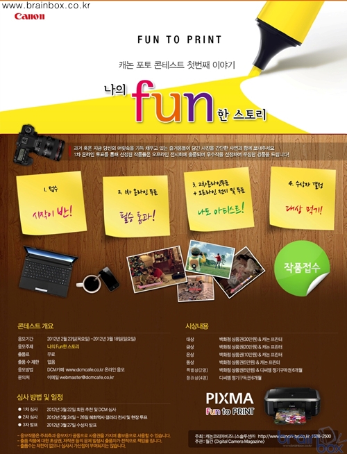 캐논코리아 비즈니스 솔루션(대표이사 김천주)은 캐논 픽스마 프린터 TV-CF 런칭을 기념해 2012년 ‘FUN TO PRINT’ 소비자 프로모션 캠페인을 진행하며, ‘나의 FUN한 스토리’라는 주제로 포토 콘테스트를 2월 23일부터 3월 18일까지 진행한다. ‘나의 FUN한 스토리’ 캐논 포토 콘테스트는 과거 혹은 현재 머릿속을 가득 채우고 있는 즐거움이 담긴 사진을 간단한 사연과 함께 DCM 카페(www.dcmcafe.co.kr)에 온라인 응모를 하면 된다. 응모일부터 3월 18일까지 회원 추천 및 DCM 심사를 통해 1차 온라인 투표가 진행되며, 선정된 작품들은 2차온라인 투표와 함께 3월 24일~26일까지 혜화역사 갤러리에 전시되며, 현장 투표와 DCM심사를 통해 3월 27일 최종 수상자를 발표할 예정이다. 또한 캐논코리아 비즈니스 솔루션 본사에서 시상식이 예정되어 있어 특별한 경험이 될 수 있을 것이다. 이번 행사에 대한 문의 사항은 이메일 (webmaster@dcmcafe.co.kr)로 문의하면 된다. 대상으로 선정된 고객에게는 캐논 복합기와 백화점 상품권(30만원), 금상은 캐논 프린터와 백화점 상품권(20만원), 은상은 캐논 프린터와 백화점 상품권(10만원), 동상은 캐논 프린터와 백화점 상품권(5만원), 특별상 2인은 백화점 상품권(5만원)과 월간 <DCM> 6개월 정기 구독권, 장려상 4인은 월간 <DCM> 6개월 정기 구독권을 경품으로 제공할 예정이다. 캐논코리아 비즈니스 솔루션 관계자는 “캐논 픽스마 프린터 TV-CF 런칭을 기념해 2012년 ‘FUN TO PRINT’ 소비자 프로모션 캠페인의 일환으로 진행되는 캐논 포토 콘테스트는 소비자들의 즐거운 추억을 사진으로 담아보고, 전시회를 통해 공유할 수 있는 기회”라며, “캐논 포토 콘테스트 이외에도 ‘DCM 출사’ 등 다양한 고객 프린팅 체험 이벤트가 연이어 진행될 예정”이라고 밝혔다.