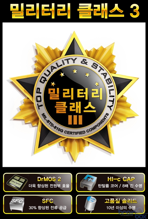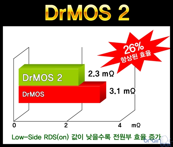 밀리터리 클래스 3 디자인에 새롭게 추가된 DrMOS 2칩셋은, 기존 칩셋에 비해 온도에 따라 2중으로 시스템을 보호할 수 있는 기능이 추가되었으며, Low-Side RDS(on) 값이 기존 DrMOS 칩보다 더 낮아져 발열량이 줄어들었으며, 칩 내부에 흐를 수 있는 전류의 양이 증가되어 전원부 효율이 더욱 증가한 특성을 제공한다.