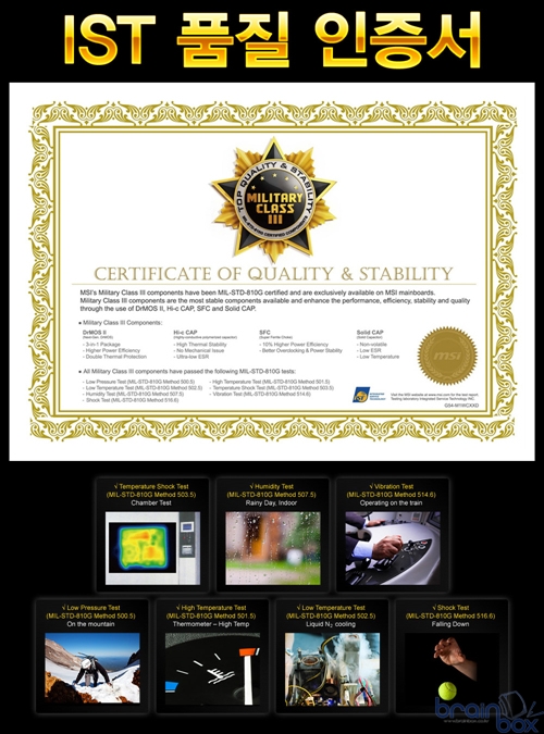 ※ 밀리터리 클래스 3 부품이 통과한 테스트 (MIL STD는 미 국방성 통과 기준) MSI 밀리터리 클래스 3 디자인에 속한 부품들은 우수한 품질과 내구성으로, IST (Integrated Service Technology) 그룹의 공식 인증서를 발급 받았다. IST 는 다양한 하드웨어 제품의 품질과 안전성을 테스트하는 전문 연구기관으로, 습도 / 고온(발열) / 충격 / 진동 등의 다양한 테스트를 미 국방성이 제시한 기준과 동일하게 진행하여 이를 통과한 제품 및 부품에 대해서 품질 인증서를 발급하게 된다. 발급된 IST 품질 인증서는, 소비자가 직접 내용을 확인할 수 있도록 제품 박스 안에 기본 제공된다. 22페이즈 디지털 전원부 ? 최강의 전원부