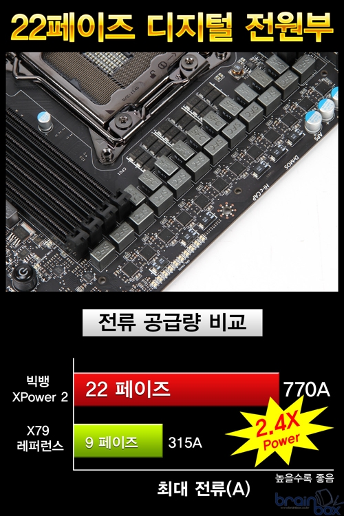 MSI 빅뱅-XPower 2 메인보드는 최신 샌디브릿지-E 프로세서로 오버클럭에 도전하기를 원하는 소비자 계층을 위하여 역대 최강의 전원부를 제공한다. 더욱 우수한 전원부 효율을 제공하는 DrMOS 2 칩셋을 기반으로 22페이즈 디지털 전원부를 제공하여, 오버클럭 환경에서도 CPU에 충분한 전력을 공급할 수 있는 특징을 제공한다. 본 제품은 22페이즈 디지털 전원부를 통해 최대 770A의 전류를 CPU에 공급해 줄 수 있는데, 이는 일반 X79 메인보드의 2.4배에 해당하는 공급량이다. 밀리터리 클래스 히트싱크 디자인
