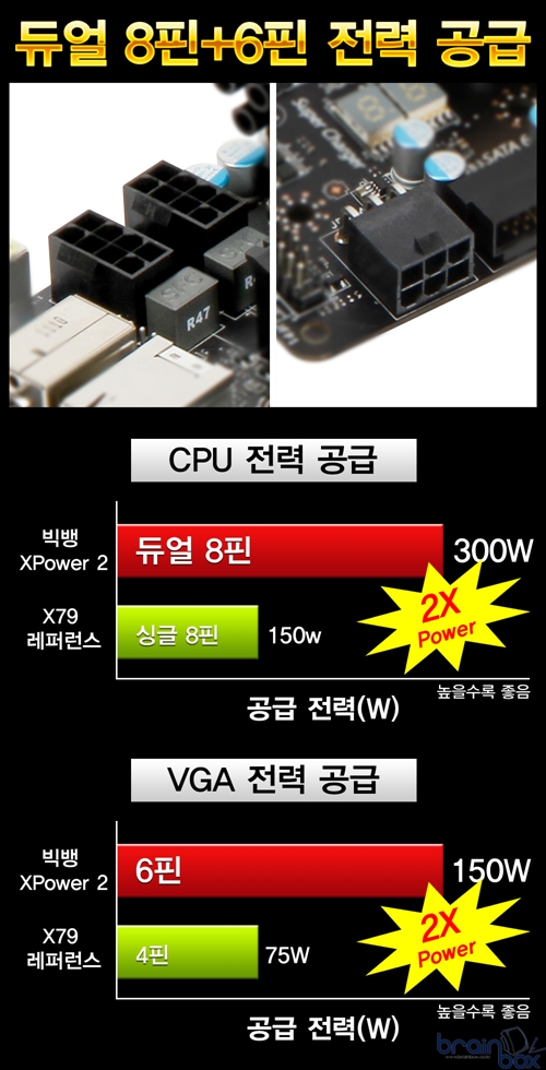 MSI 빅뱅-XPower 2메인보드는 익스트림 OC환경을 위하여 총 3개의 전원 커넥터를 제공한다. CPU 전력 공급용으로는 듀얼 8핀 전원 커넥터가 제공되어 최대 300W의 전력을 CPU에 공급해 줄 수 있는데 이는 일반 X79 메인보드와 비교하여 2배나 많은 전력 공급량이다. 아울러 CPU 와는 별도로 PCI Express 슬롯을 통해 그래픽카드 메모리에 전력을 공급해 줄 수 있는 6핀 전용 커넥터도 기본 제공되는데, 이 6핀 전용 커넥터를 통하여 최대 150W의 전력을 그래픽카드 쪽에 추가로 공급해 줄 수 있다. 클릭 바이오스 2 ? 자유로운 바이오스 셋팅