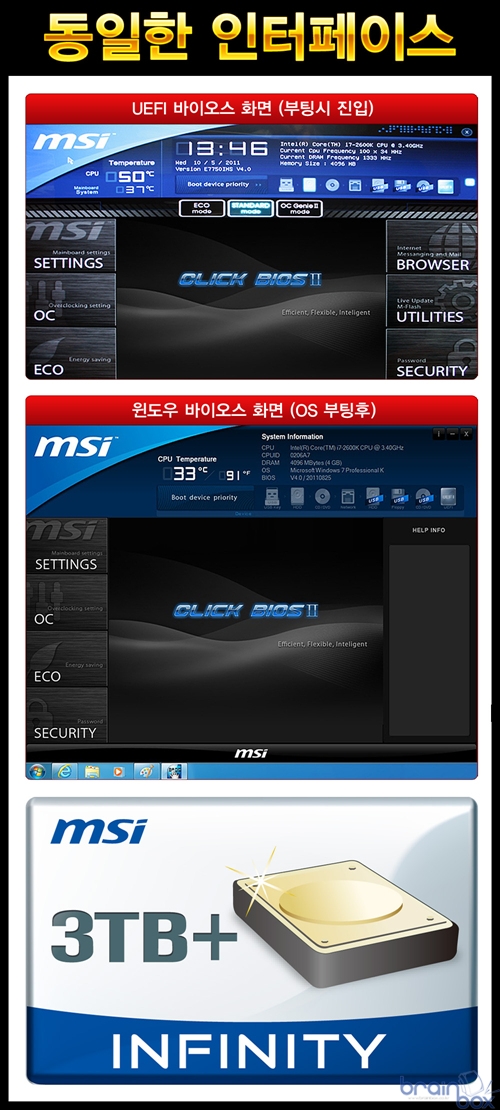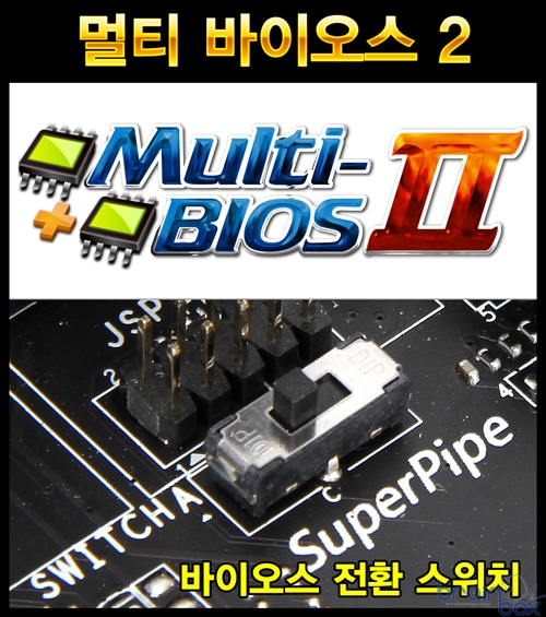 2개의 바이오스 셋팅 화면은 기본적으로 동일한 인터페이스를 채택하여 소비자의 혼동을 최소화 하였으며, 마우스를 통한 간편한 조작은 물론 최신 3TB 하드디스크까지 문제없이 사용할 수 있는 특징을 제공한다. 멀티 바이오스 2 ? 편리한 트리플 바이오스