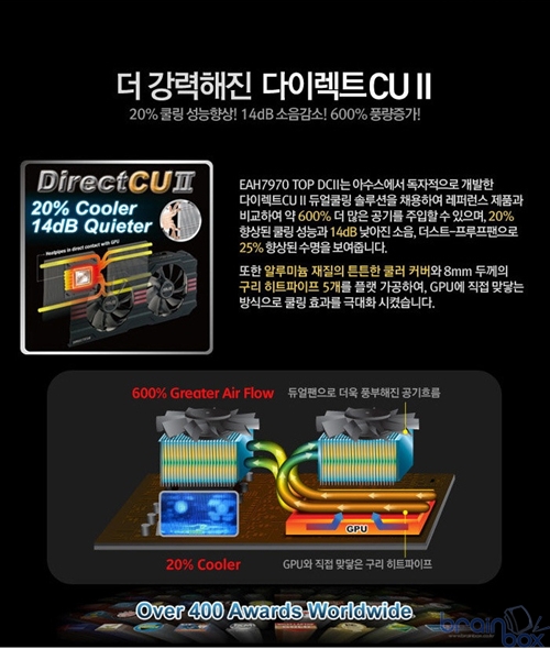 2011년 2200만대의 마더보드를 선적하며 전세계 마더보드 및 그래픽 카드 시장을 선도하고 있는 아수스 (kr.asus.com)는 올해 출시된 자사의 그래픽 카드 HD7900 시리즈가HardOCP, Legit Reviews 등15여개의 글로벌 IT 미디어에서 수상을 기록했다고 밝혔다. 세계에서 각광받고 있는 아수스 그래픽 카드는 뛰어난 능력을 바탕으로 글로벌 IT 미디어에서 최우수 제품상을 수상한 AMD 최신 플래그쉽 GPU Tewk을 탑재한 HD7970와 엔비디아 싱글 GPU 기반의 ENGTX ENGTX560, ENGTX570, ENGTX580 등 총 6개 제품이다. 이들 제품은 아수스의 독자적인 기술인 DirectCU II 쿨링 기술과 GPU Tweak 을 탑재하여 뛰어난 성능에도 쾌적한 환경을 구현, 아수스 그래픽 카드를 사랑하는 유저들에게 높은 점수를 받았다. 아수스가 독점 개발한 쿨링 솔루션인 DirectCU II는 구리 히트 파이프를 GPU에 직접 전도시켜 GPU에서 발상된 열을 약 20% 정도 더 빨리 배출 시키는 구조로 설계되어 사용자에게 보다 효과적인 쿨링 효과를 경험하게 한다. 뿐만 아니라, 세계 최고의 오버클러킹 기술을 보유한 아수스의 독점 기술 GPU Tweak으로 실시간으로 최대 10% 이상의 오버 클럭킹은 물론 클럭에 따른 안정적인 전압, 그래픽 카드 팬 스피드, 2D/3 스위칭 등 사용자 본인에게 최적화된 환경을 설정할 수 있다. 미국의 하드웨어 전문 웹사이트 HardOCP에서 에디터스 초이스로 선정된 아수스 그래픽 카드 HD7970은 AMD 라데온 HD7970 레퍼런스 버전으로 깊은 인상을 주었고, 전천후 솔리드 비디오 카드이자 ROG 제품의 마성을 이어 나가는 제품이 될 것이라는 데 이견이 없다는 평가를 받았다. 이 제품은 이전 HD6970 GPU 40nm대비 약 30% 향상된 성능을 보이는 최신 HD7970 GPU와 HD 해상도에서도 충분한 3D 그래픽 버퍼를 소화하는 3GB GDDR5 메모리를 탑재한 플래그쉽 그래픽 카드 제품이다. 아수스 그래픽 카드에서만 사용 가능한 GPU Tweak 을 탑재해 실시간으로 GPU의 전압과 클럭을 설정할 수 있어, 타사 동일 제품에 비해 더욱 향상된 성능을 경험하게 해준다. 여기에 새로운 PCI Express 3.0과 AMD Eyefinity™ 멀티 스크린 기술, DirectX® 11 지원으로 차세대 HD 게임을 구현할 수 있는 완벽한 PC 그래픽 환경을 제공해 주는 그래픽 카드이다.