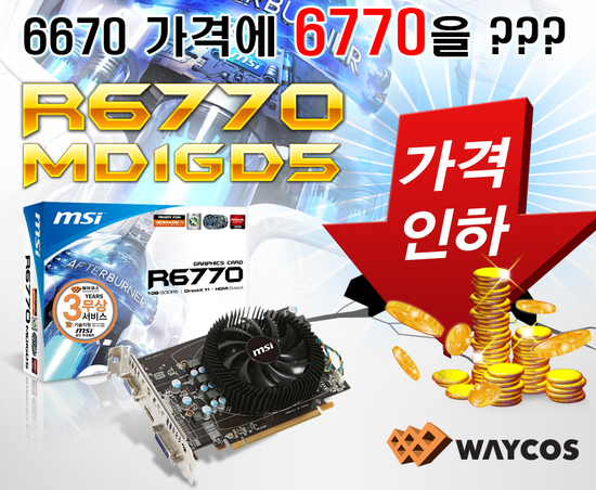 웨이코스는 MSI 그래픽카드 구매 고객을 위한 특가 진행을 통해 라데온 6770 1GB 제품을 R6670 가격에 구입할 수 있도록 했다.