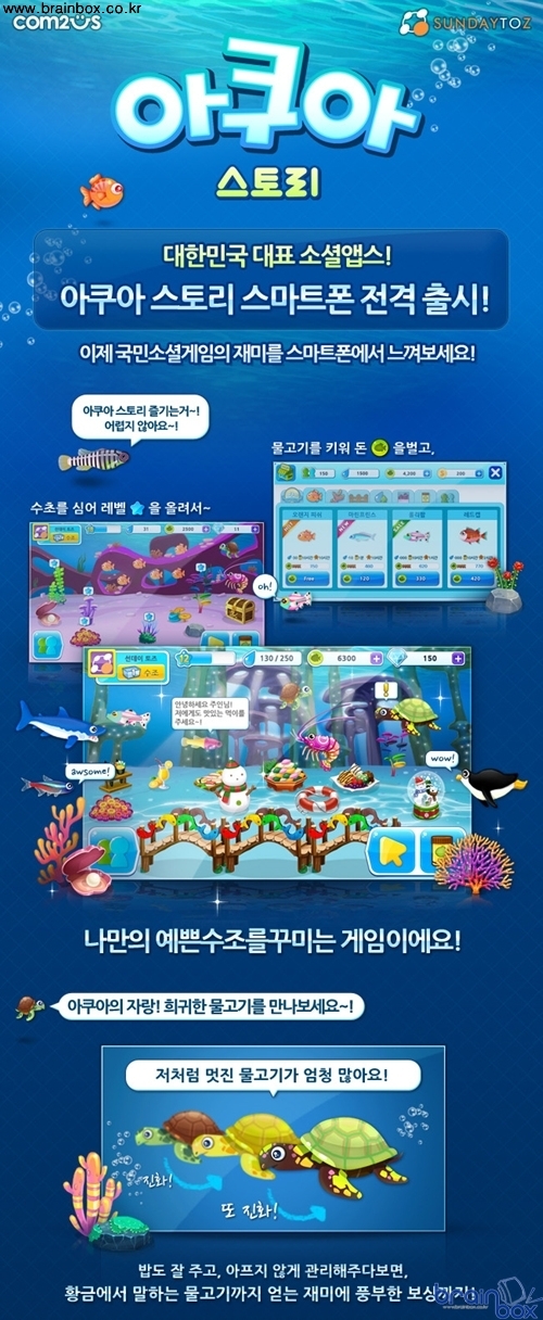 컴투스[078340](대표 박지영, www.com2us.com)는 27일 자사 홈페이지와 주요 모바일 게임 정보 사이트를 통해, 신작 모바일 SNG ‘아쿠아 스토리’의 게임 스크린샷 이미지, 소개 영상과 함께 게임의 주요 기능을 최초로 공개했다. ‘아쿠아 스토리’는 선데이토즈가 개발해 이미 PC용 웹 서비스를 통해 200만 유저가 즐기는 등 국내에서 큰 인기를 모으며 게임성을 인정받은 SNG로, 다년간 글로벌 모바일 시장에서 선두기업으로 인지도를 쌓아온 컴투스가 모바일 버전의 퍼블리싱을 맡으며 출시 이전부터 글로벌 성공 가능성에 대해 큰 기대를 모으고 있다. 이번에 공개된 게임 내용을 보면, PC 버전 ‘아쿠아 스토리’의 핵심인 물고기 5단계 진화 시스템과 친구 수조를 방문해 물고기를 돌보거나 선물을 보내는 등의 소셜 요소를 모바일에서도 그대로 즐길 수 있도록 구성하고, 스마트폰에 최적화된 인터페이스와 다양한 물고기, 기능성 아이템 추가 등 한층 보강된 콘텐츠로 모바일 버전 만의 재미를 더했다. 컴투스에서는 모바일 ‘아쿠아 스토리’가 육성 요소와 함께 소셜 요소를 성공적으로 잘 융합시키고 모바일 환경에 맞게 쉽고 직관적인 조작법으로 재구성해, 기존 모바일 SNG를 즐기던 유저들뿐만 아니라 처음 즐기는 유저들도 쉽게 적응하고 내 손안의 수조를 예쁘게 꾸려나가는 재미에 빠지게 될 것으로 기대하고 있다. 모바일 ‘아쿠아 스토리’는 안드로이드 폰 용으로 먼저 제작되어 27일부터 스페인 바르셀로나에서 열리는 ‘MWC(모바일월드콩그레스) 2012’를 통해 최초 공개될 예정이며, 국내 오픈마켓을 통해 3월 중 출시될 예정이다. 게임에 대한 자세한 내용은 컴투스 홈페이지(www.com2us.com)에서 확인 가능하다.