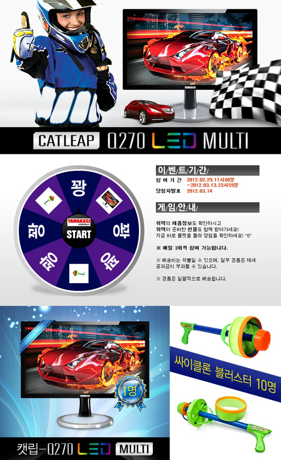 ‘야마카시 캣립 Q270 LED MULTI’는 독특한 디자인과 스탠드 기능을 그대로 가지면서 DVI 전용 모델의 문제였던 일부 그래픽카드와의 호환성을 해결했다. 또 같은 사양 모니터들에 비해 낮은 68W의 소비전력과 0.7W의 대기전력으로 전력부담을 줄였다.