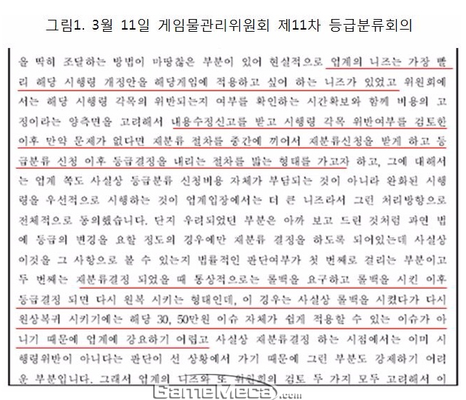 유 의원은 게임사들이 불법행위를 할 수 있었던 배경에는 게임위와의 사전 모의와 눈감아주기가 있었다고 주장했다. 3월 11일에 열린 게임위 등급분류 회의 현장에서는 '내용 수정 신고를 받고 만약 문제가 없다면 재분류 절차를 중간에 끼어서 등급결정을 내리겠다'라고 말했다. 이어서 '업계도 등급분류 신청비용 자체가 부담되는 것이 아니라 완화된 시행령을 우선적으로 시행하는 것에 더 큰 니즈를 가지고 있어 그렇게 처리하기로 전체적으로 동의했다'는 내용이 있다.