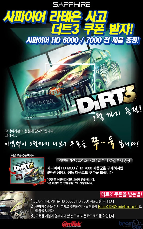 - 3월 한 달, 라데온 HD 6000, HD 7000 시리즈 구매 고객에게 <DiRT3> 정품 게임 쿠폰 증정 국내 컴퓨터 그래픽카드 시장을 선도하고 있는 (주)이엠텍아이엔씨(대표:이덕수)가 3월 한 달동안 사파이어 라데온 HD 6000, HD 7000 시리즈 그래픽카드를 구입하면 인기 레이싱 게임 <DiRT3>를 무료로 제공하는 행사를 진행한다.
