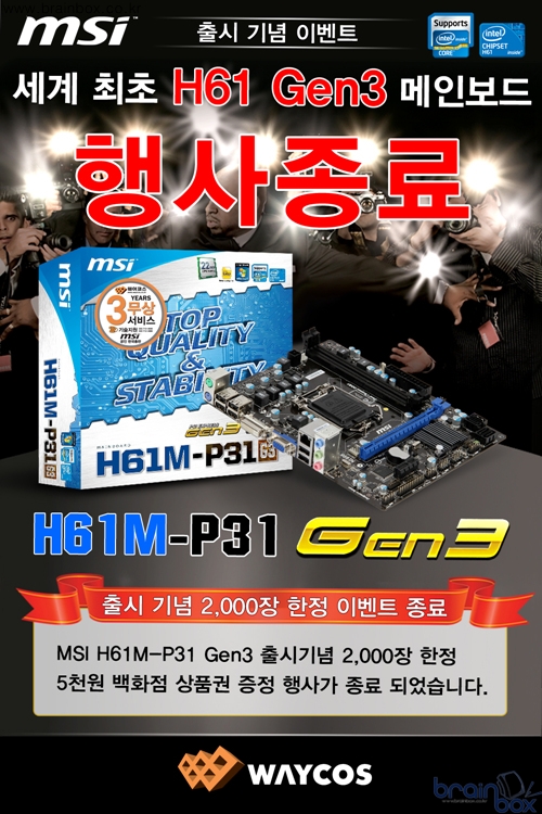 세계 정상급 토탈 IT 솔루션 제조사, MSI의 한국 공식 디스트리뷰터인 ㈜웨이코스(대표:고민종)가 H61 메인보드로 2번째 Gen3 를 지원하는 “MSI H61M-P31 Gen3” 메인보드 출시를 기념하여 진행한 백화점 상품권 증정 행사가 종료 되었다. H61 Gen3 출시 기념 - 백화점 상품권 행사 종료