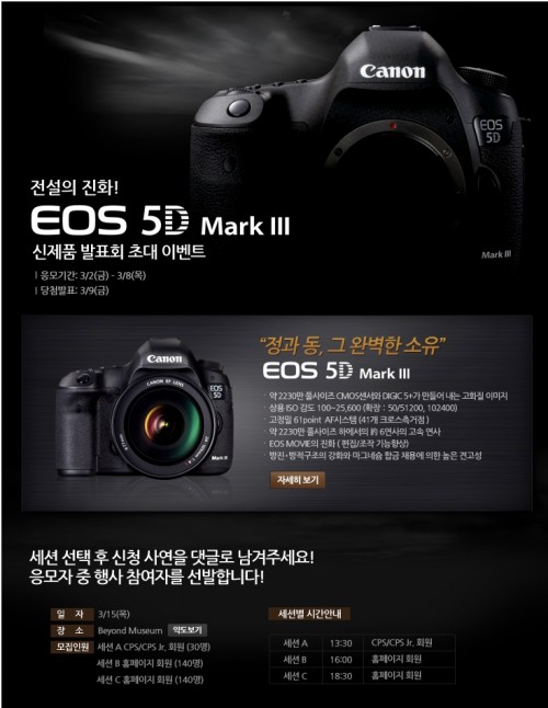 [피씨비/pcBee 김민선 기자] 캐논코리아컨슈머이미징(대표 강동환 www.canon-ci.co.kr)은 오는 15일 서울 청담동 비욘드뮤지엄에서 국내 최초로 유저들에게 신제품 DSLR 카메라인 ‘EOS 5D Mark III’를 공개하는 런칭쇼를 개최한다.