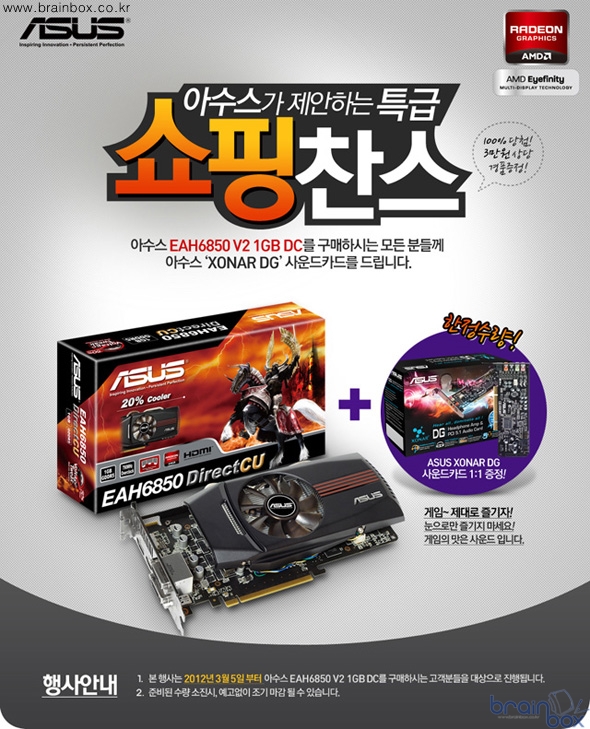ASUStek사의 국내유통사인 에스티컴퓨터(대표 서희문)는 ASUS EAH6850 V2 1GB DC 그래픽카드를 구매하면 XONAR DG 사운드카드를 증정하는 특급 쇼핑찬스 이벤트를 진행한다.