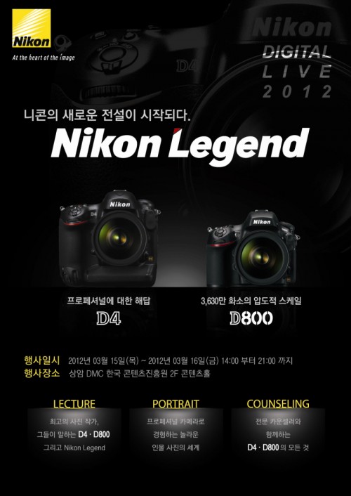 니콘이미징코리아(대표 우메바야시 후지오 www.nikon-image.co.kr)는 프로 사진가를 위한 DSLR 카메라 D4와 D800의 정식 출시를 기념해 15일부터 16일까지 서울 상암동 디지털미디어시티(DMC) 한국 콘텐츠 진흥원에서 대규모 소비자 체험 행사인 ‘니콘 디지털 라이브 2012(Nikon Digital Live 2012)’를 Nikon Legend 라는 주제로 개최한다.
