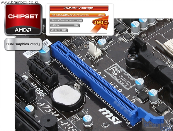 MSI A75MA-P35 메인보드는 AMD A 시리즈 CPU 내부에 기본 제공되는 GPU 칩셋에 외장형 HD6500 그래픽카드 장착 시 외장그래픽카드의 성능을 최대 390% 향상시켜주는 기술을 제공한다. 네이티브 USB 3.0 / SATA 6GHz - 초고속 인터페이스 제공