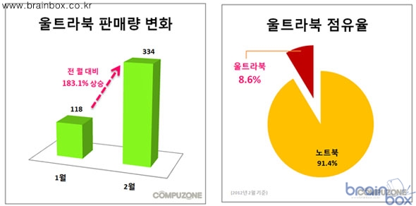 1월 대비 2월 울트라북 판매량 180% 이상 성장 슬림하고 가벼움은 물론 SSD 탑재로 성능까지 뛰어난 울트라북이 노트북 시장에 돌풍을 일으키고 있다.스마트폰, 태블릿PC 에 밀려 잠시 주춤해 보였던 노트북 시장이 삼성, LG 등 대기업이 적극적으로 울트라북 신제품을 잇따라 출시하며 노트북 시장에 활기를 불어넣고 있다. 컴퓨터 전문 쇼핑몰 컴퓨존 (대표 노인호, www.compuzone.co.kr) 이 발표한 판매량에 따르면 1월 울트라북은 118대 판매하였으나 2월에는 334대 판매, 180% 이상 판매량이 증가했다. 노트북 내 점유율도 1월은 5% 였으나 2월은 8 .6% 차지하며 노트북 전체 매출의 13% 기여했다.