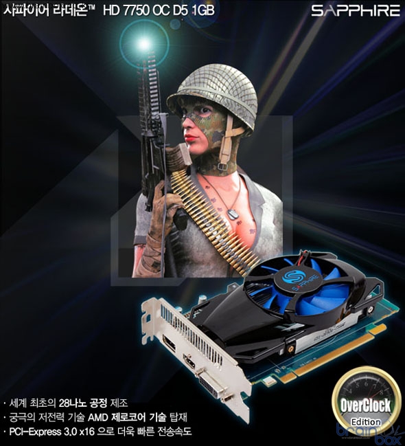 - 28nm GCN 아키텍쳐로 탄생한 에너지 절약형 주류급 그래픽카드 국내 컴퓨터 그래픽카드 시장을 선도하고 있는 (주)이엠텍아이엔씨(대표:이덕수)는 팩토리 오버클럭으로 성능을 한층 업그레이드 한 <SAPPHIRE Radeon HD 7750 OC Edition> 그래픽카드를 선 보이고 주류급 그래픽카드 시장을 향한 본격적인 세대 교체 작업에 박차를 가한다. 28nm 공정 기술과 혁신적인 GCN(Graphics Core Next) 아키텍처 그래픽 엔진을 기반으로 512개의 스트림 프로세서와 팩토리 오버클럭 된 850MHz의 빠른 GPU 속도를 바탕으로 강력한 3D 성능과 부드럽고 섬세한 그래픽을 구현해준다.