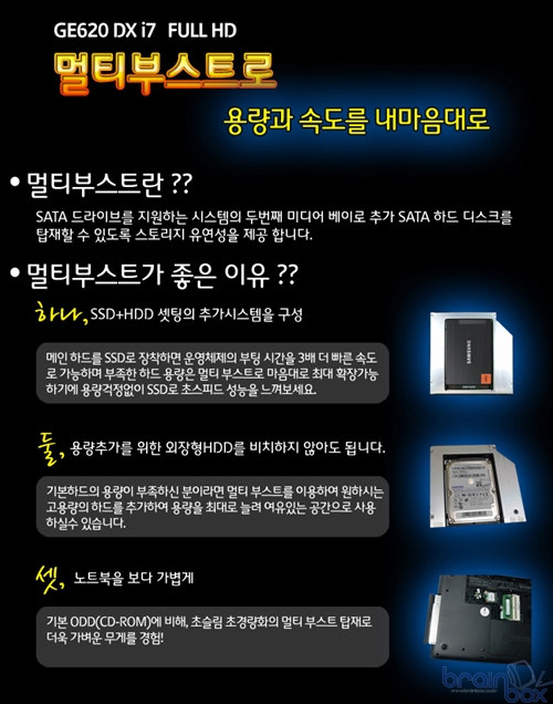 즉, ODD를 빼고 SSD를 추가 함으로서 초고속 부팅, 고속 어플리케이션 실행에 SSD를 사용하고 데이터 보관, 백업등을 HDD로 할수 있다. 금번 이벤트 행사로 이지가이드에서는 멀티부스트 모델 선택시 기존 ODD를 외장케이스에 장착해 제공하는 서비스도 진행하고 있다.
