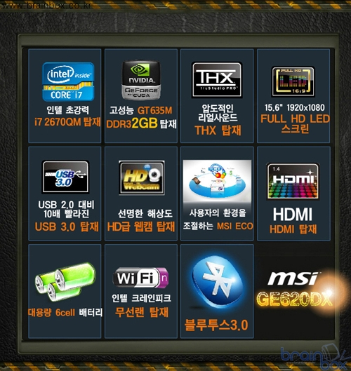 GE620DX i7 시리즈의 특징 - 인텔 2세대 코어i7 2670 QM 쿼드 코어 프로세서를 적용 (샌디브릿지) - 엔비디아 NVIDIA 지포스 GT635M GPU + 2GB 그래픽 메모리 탑제 - FULL HD LED 백라이트 LCD 화면 제공 - 멀티부스트 지원 !!!