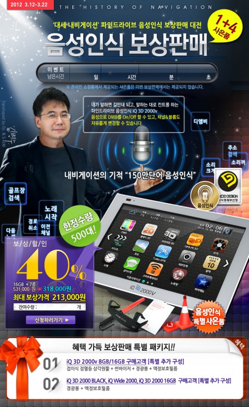 최신형 모델 파인드라이브 iQ 3D 2000v 8G는 정상가에서 39% 할인된 29만 9천원, 16G는 31만8000원에 구입 가능하다. 또 해당 제품을 구매하는 모든 소비자들에게는 기존 구성품인 TPEG, 리모콘, SD카드리더기 3종과 더불어 안전운전을 위한 ‘접이식 점멸등 삼각원뿔’과 ‘경광봉’, 내비게이션용 액세서리 ‘액정보호필름’, ‘썬바이저’ 등 ‘특별 구성품’ 4종을 추가로 증정한다.