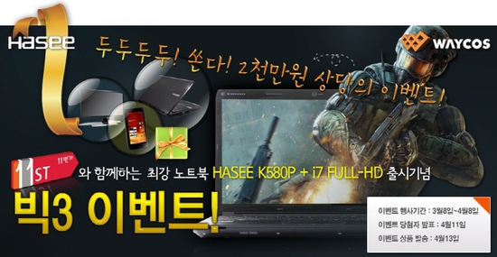 웨이코스가 고사양 노트북 시장에서 누구도 따라올 수 없는 가격과 성능을 갖춘 K580P+ i7 Full HD를 출시한다. 또 그 기념으로 2000만원 상당의 대형 이벤트를 진행한다.