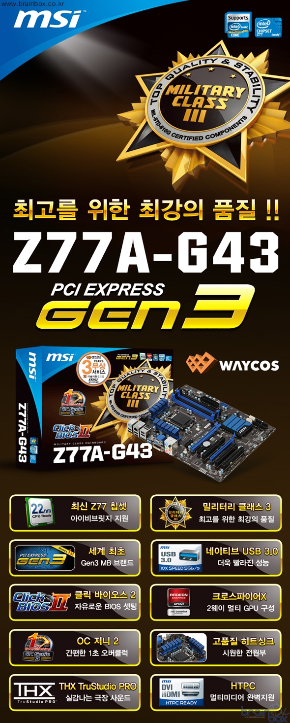 세계 정상급 토탈 IT 솔루션 제조사, MSI의 한국 공식 디스트리뷰터인 ㈜웨이코스(대표:고민종)가, 한국 최초로 인텔의 최신형 Z77 칩셋을 장착한 “MSI Z77A-G43 Gen3” 메인보드를 출시하였다.