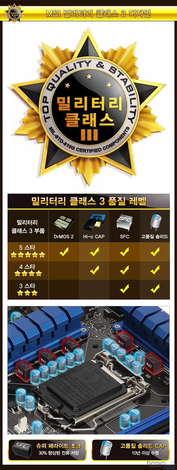 MSI Z77A-G43 Gen3 메인보드는 더욱 우수한 품질을 제공하기 위하여, 밀리터리 클래스 3 디자인을 적용하였다. 본 제품에 장착된 SFC (슈퍼 페라이트 초크) 는 기존 초크보다 30% 향상된 전류 저장능력 및 오버클러킹 환경에서도 안정적인 전원을 공급할 수 있는 특징을 제공한다. 아울러 전체 기판에 사용된 고품질 솔리드 캐패시터는 풀로드 상태를 기준으로 10년이라는 긴 수명을 제공하여, ESR 특성 부분에서도 기존 솔리드 캐패시터보다 30% 낮은 특성을 제공한다.