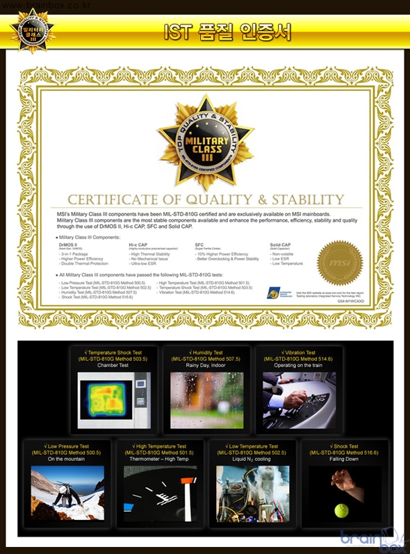 ※ 밀리터리 클래스 3 부품이 통과한 테스트 (MIL STD는 미 국방성 통과 기준) MSI 밀리터리 클래스 3 디자인에 속한 부품들은 우수한 품질과 내구성으로, IST (Integrated Service Technology) 그룹의 공식 인증서를 발급 받았다. IST 는 다양한 하드웨어 제품의 품질과 안전성을 테스트하는 전문 연구기관으로, 습도 / 고온(발열) / 충격 / 진동 등의 다양한 테스트를 미 국방성이 제시한 기준과 동일하게 진행하여 이를 통과한 제품 및 부품에 대해서 품질 인증서를 발급하게 된다. 발급된 IST 품질 인증서는, 소비자가 직접 내용을 확인할 수 있도록 제품 박스 안에 기본 제공된다. 차세대 PCI Express 3.0 (Gen3) 공식 지원