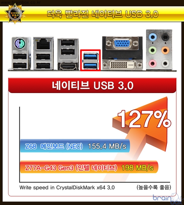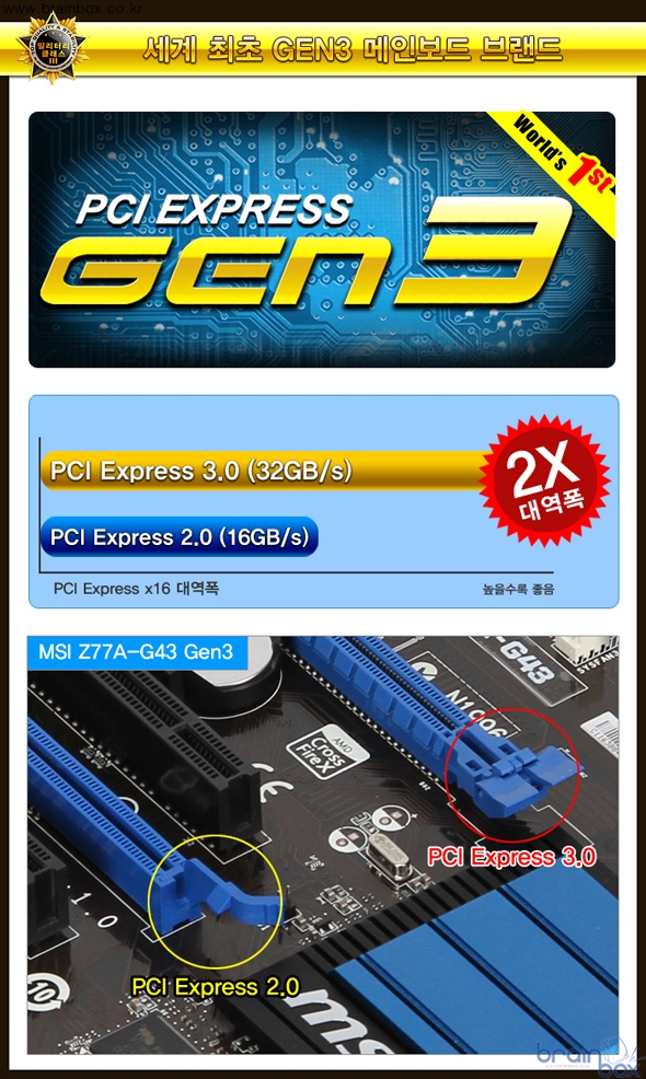 MSI Z77A-G43 Gen3 메인보드는 차세대 인터페이스인 PCI Express 3.0 을 공식 지원하는 제품이다. 차세대 PCI Express 3.0 인터페이스는 기존 PCI Express 2.0 인터페이스에 비해 2배 더 많은 대역폭(32GB/s) 을 제공한다. 더욱 빨라진 네이티브 USB 3.0